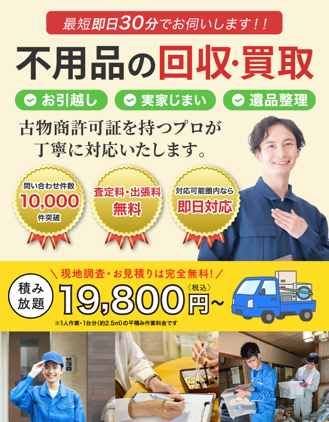 ただし状態が悪すぎる場合は買取が難しく、有料回収や処分のご案内になるケースもあります。